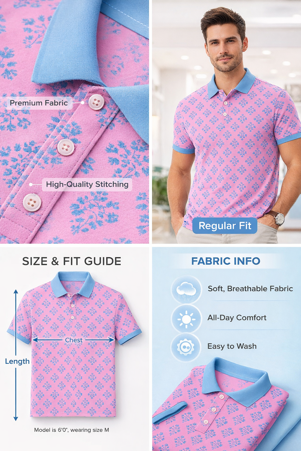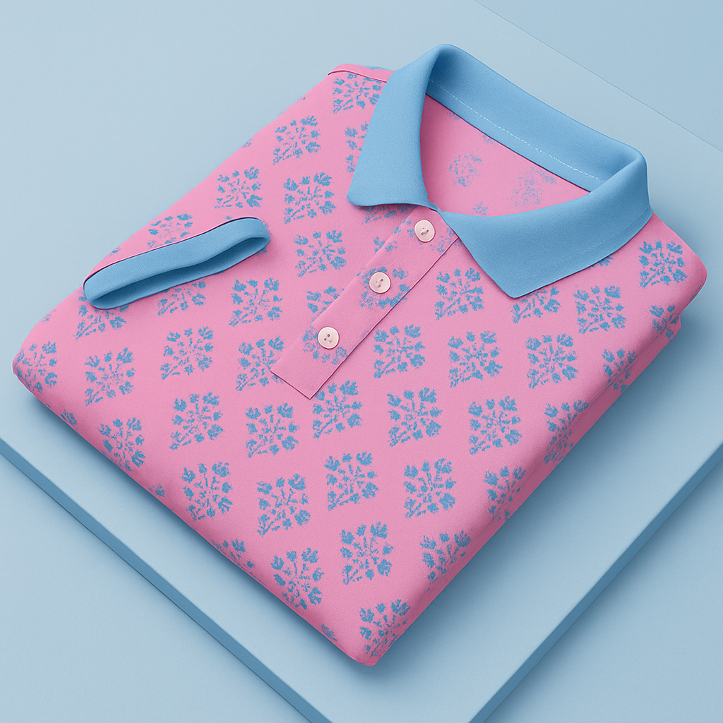 Pink Floral Polo T-Shirt with Sky Blue CollarPink Floral Polo T-Shirt with Sky Blue Collar